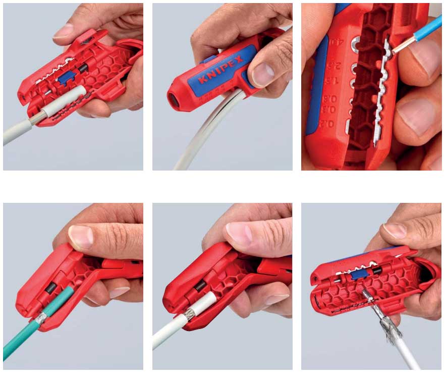 Используя отверстия разных диаметров (на прищепке) вы получаете универсальный инструмент для снятия как внешней оболочки, так и покрытия непосредственно на проводниках.