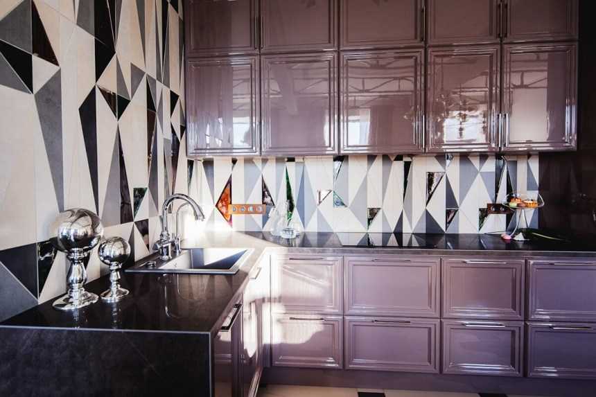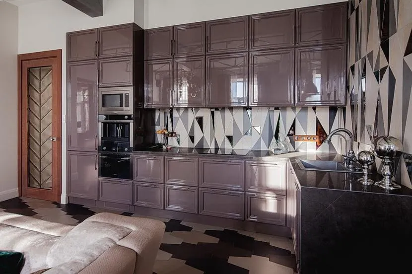 Зеркальное покрытие применяется к шкафчикам, их дверцам. Посуда, сервизы и другие атрибуты приготовления пищи хранятся в шкафах. Стиль призван показать кухню уютным местом отдыха.