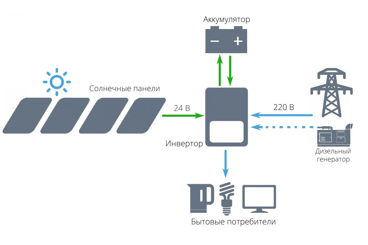 Автономный инвертор. Прибор запитывается от аккумулятора, который получает заряд от солнечных панелей через МРРТ-контроллер. В системе используются батареи разных типов, в том числе высокотехнологичные литиевые аккумуляторы.