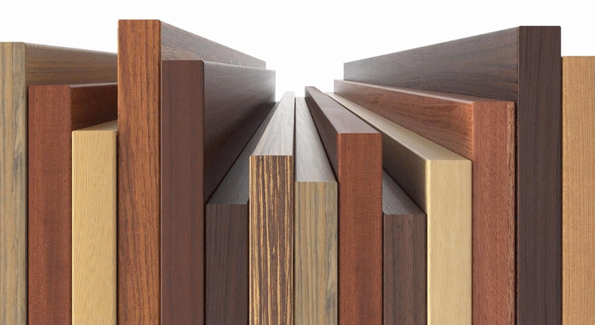 Фасады изготавливаются на основе МДФ или ДСП. В отличие от пленки, обе стороны шпона приклеиваются к поверхности. Он легче цельного дерева и выглядит воздушнее.