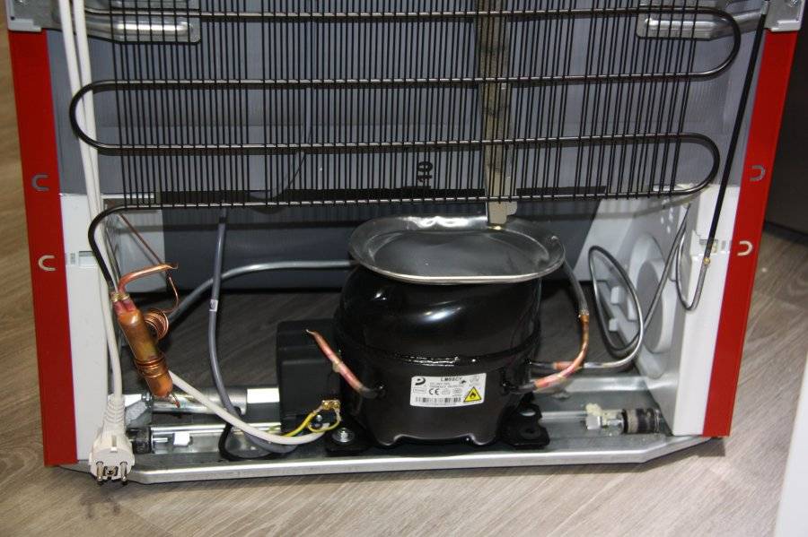 - Перегревание двигателя. Он имеет защиту, которая активируется при высоких температурах. Проверяется это следующим способом: подносим руку к двигателю, он расположен сзади, внизу холодильника, если жар сильный, это значит, что причина подтверждена. Далее отодвигаем агрегат от стены, отключаем питание и даем полностью остыть. Если при включении всё наладилось, то морозильник не успевал сбрасывать температуру.
