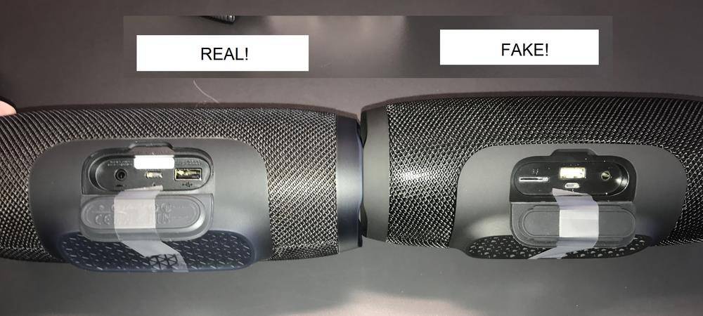 Поддельная колонка в разы легче оригинальной, она хлипкая, логотип может быть приклеен криво и отрывается с минимумом усилий. Если сравнить внешний вид сомнительной колонки с изображением, приведённом на официальном сайте JBL, будут видны отличия в мелочах: расположение кнопок, надписи на разъёмах и т.п. Самое главное — на поддельной колонке нет серийного номера или он не проходит проверку на сайте производителя. Звучание подделки, само собой, гораздо менее качественное: динамики не воспроизводят басы и верхние частоты, поэтому звук не такой глубокий и звонкий, как у оригинала.