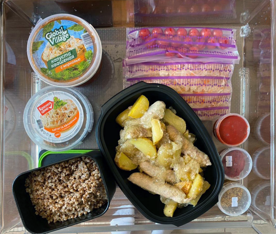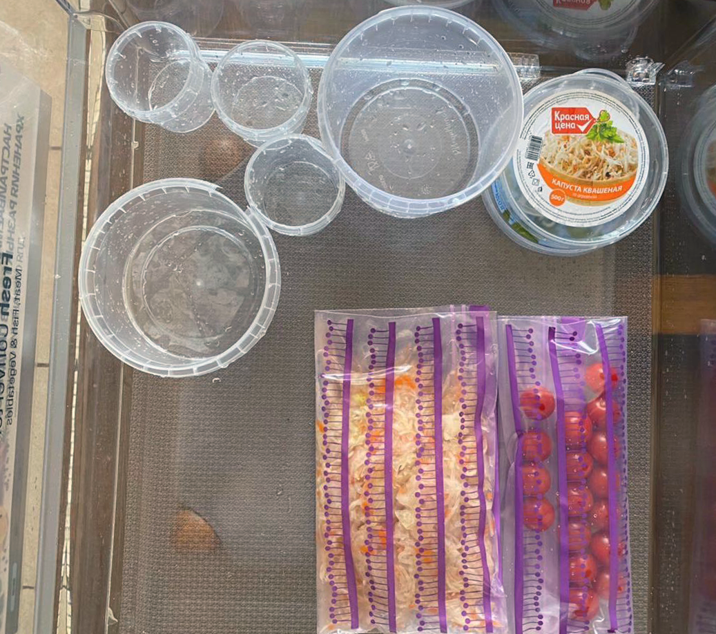 В пластиковые баночки из доставки роллов переложим горчицу и томатную пасту, а в банки от капусты — курицу и гречку. Капусту и помидоры заморозим, чтобы использовать позже