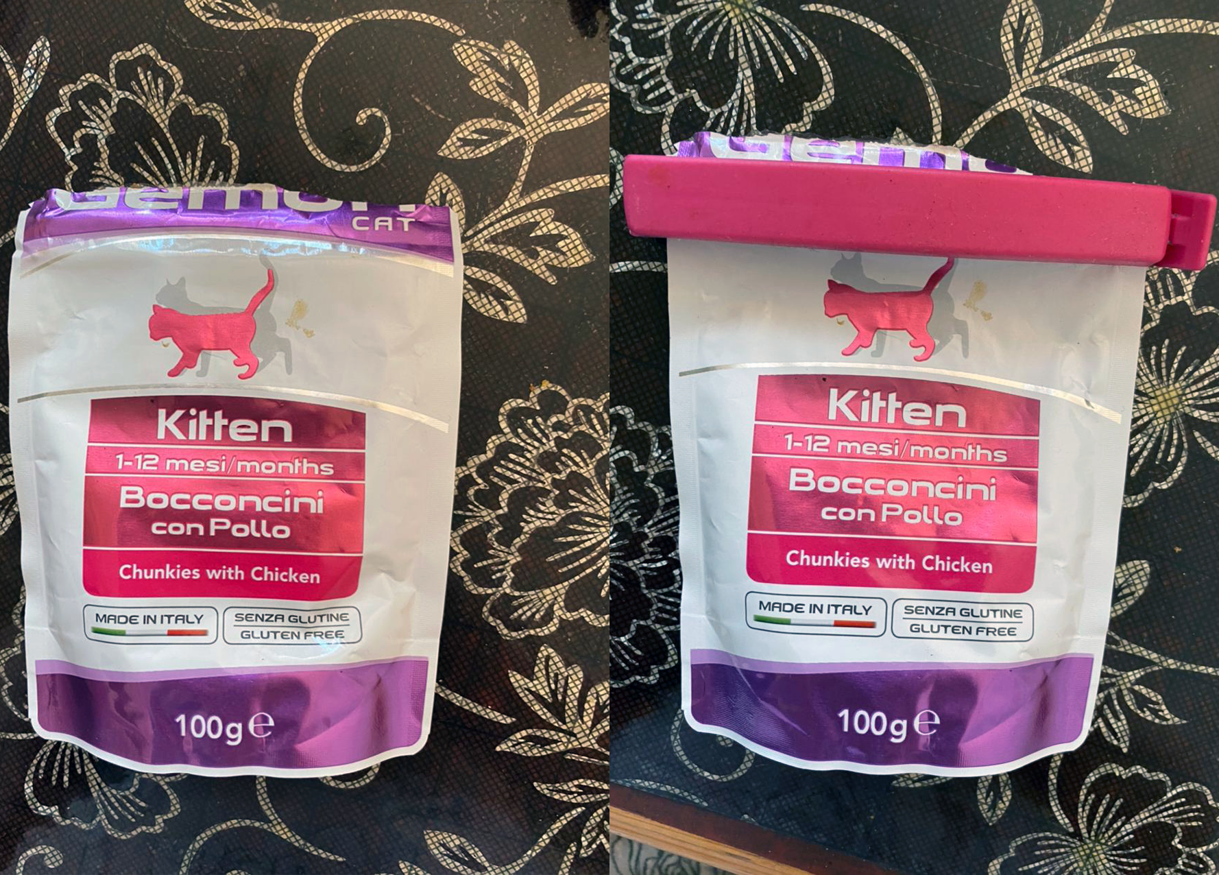 Кошачью еду закрываем зажимами, чтобы не пачкала всё вокруг. Зажимы можно купить в Икее — 10 штук за 59 рублей — или заменить резинками для денег