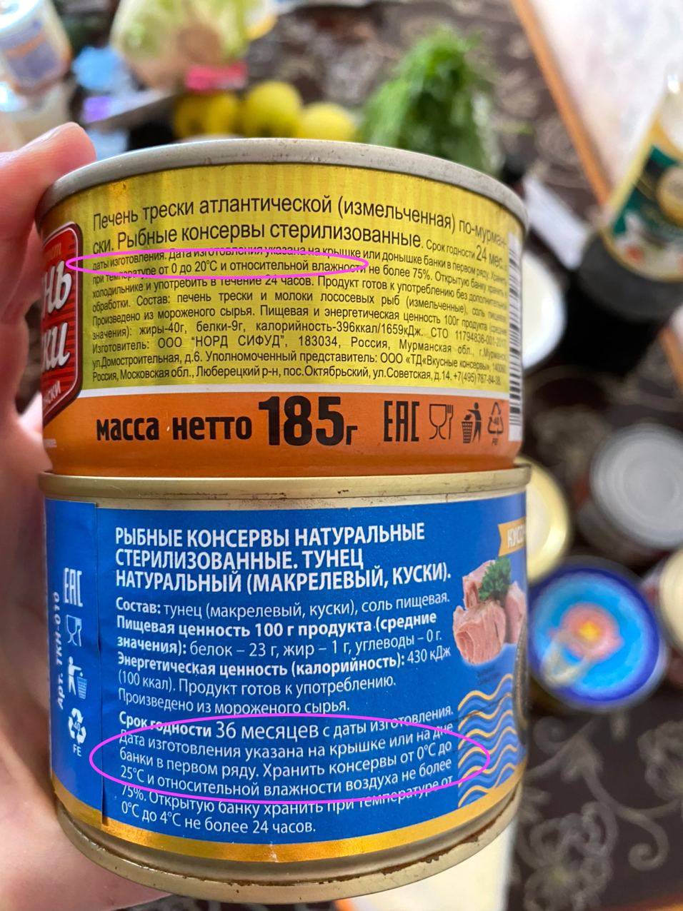 Среди еды из холодильника оказались консервы — они занимали отдельную полку на дверце. Проверяем условия хранения:
