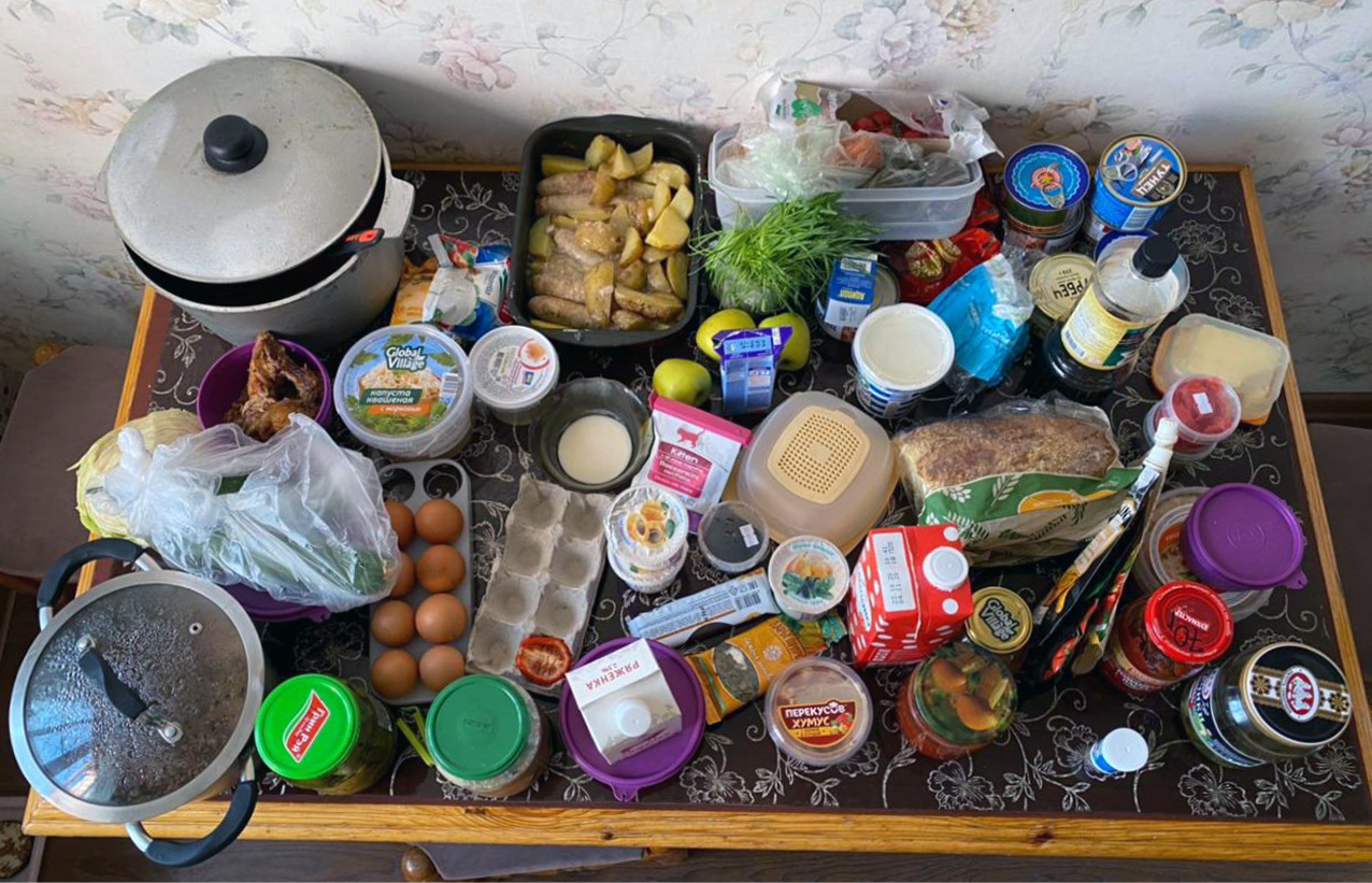 - на средней — молоко, йогурты, сметана, масло, сыр, курица и борщ в контейнерах;