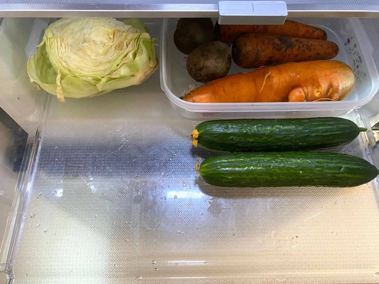 В ящике для овощей ставим контейнер под морковь и свеклу, оставляем свежую капусту и огурцы, а яблоки моем и оставляем в вазочке на столе: