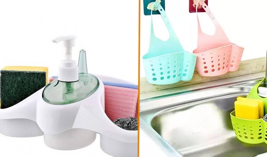 Один из самых популярных способов, особенно в последнее время. Такие органайзеры можно заказать на Алиэкспресс или Ozon (советуем внимательно читать отзывы) или поискать в хозяйственном магазине. Цена на держатели для губок может составлять от 100 до 2000 рублей в зависимости от конфигурации и материалов.
