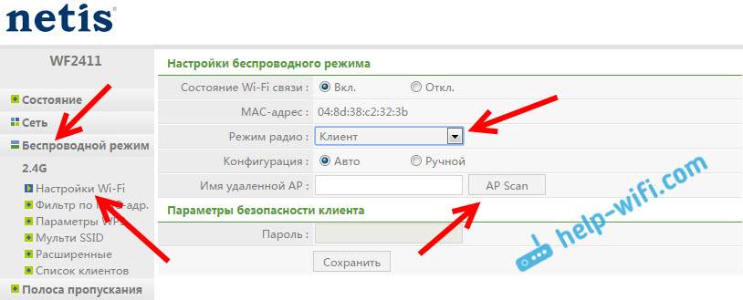 Все очень просто. В настройках, в которые можно зайти по адресу netis.cc переходим в расширенные настройки нажав на большую кнопку Advanced и сразу переходим на вкладку “Беспроводной режим” – “Настройки Wi-Fi”. В выпадающем меню “Режим радио” выберите “Клиент”. Нажмите на кнопку “AP Scan”.