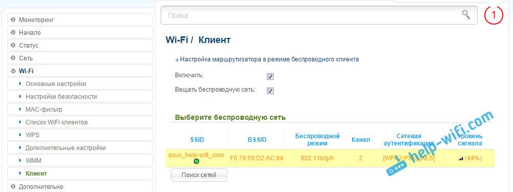 Более подробную инструкцию по настройке режима клиента на устройствах D-Link смотрите здесь: https://help-wifi.com/sovety-po-nastrojke/nastrojka-dvux-routerov-v-odnoj-seti-soedinyaem-dva-routera-po-wi-fi-i-po-kabelyu/. Смотрите после заголовка “Подключение роутера D-Link к другому роутеру по Wi-Fi (режим клиента)”. Там все подробно расписано. Возможно, позже подготовлю отдельную инструкцию.