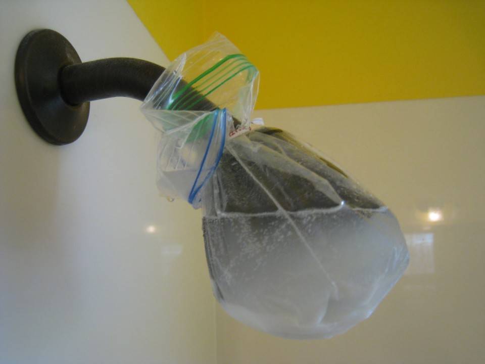 Если смеситель для душа закреплен к стене или стенке кабины и его демонтаж нежелателен, можно воспользоваться более действенным составом – смесью уксуса и пищевой соды. Процесс очистки выглядит следующим образом: