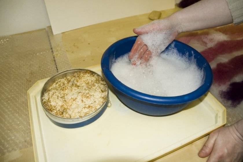 - Делаем мыльный раствор, используя стружку хозяйственного мыла (четверть бруска на 1 л воды), протираем губкой пятно и смываем чистой водой.