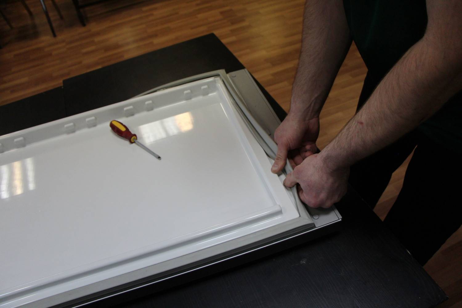 После этого с двери снимают поворотные петли и ручку. Детали переставляют на другую сторону корпуса. При ремонте холодильников с дисплеем выполняют следующие действия: