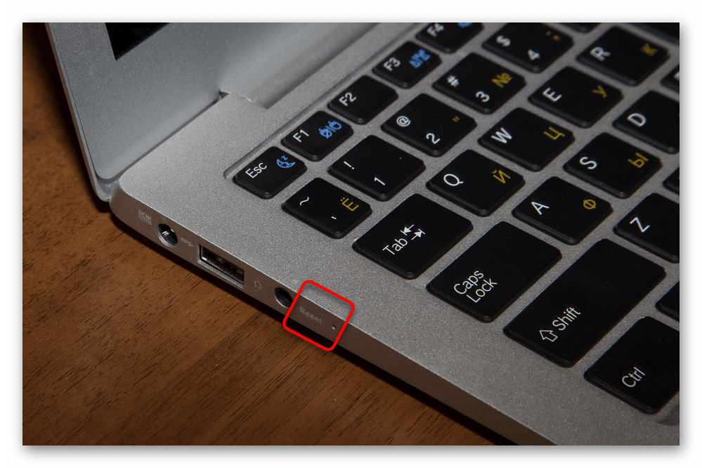 Поскольку аккумулятор извлекается далеко не везде (в современных ноутбуках и ультрабуках для этого требуется снять заднюю крышку целиком), некоторые производители предусматривают возможность завершения работы при зависании, добавляя кнопку «Reset». Поищите ее слева, справа (на гранях она, как правило, утопленная в корпус) и, если найдете, возьмите тонкий и островатый предмет, например, стержень ручки. Просуньте его туда, нажмите и удерживайте примерно 10 секунд — обычно при нажатии слышен характерный звук щелчка кнопки. Дождитесь, пока лэптоп отключится, и отпустите кнопку.