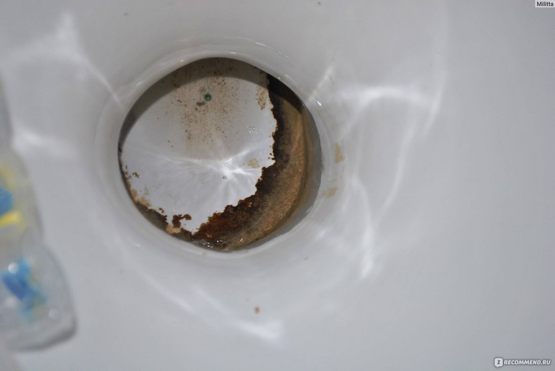 Ржавый налет растворяется, когда жидкость при помощи специальной насадки на бутылке распределяется по окружности под ободком. Выдержав нужное время, ее смывают водой. Кислотные очистители хорошо справляются при застарелых загрязнениях. Слишком часто их применять не стоит.