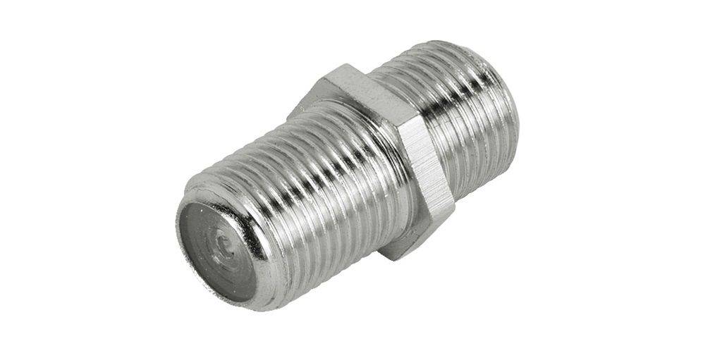 F-разъемы – это специальная металлическая конструкция, которая позволяет надежно соединить два отрезка кабеля без применения паяльника или дополнительной изоляции. Метод зачастую применяется, когда при перемещении телевизора в другой конец комнаты, имеющегося запаса кабеля не хватает либо требуется заменить поврежденный участок. Это самый простой и экономный способ, в отличие от прокладки нового кабеля непосредственно от антенны.