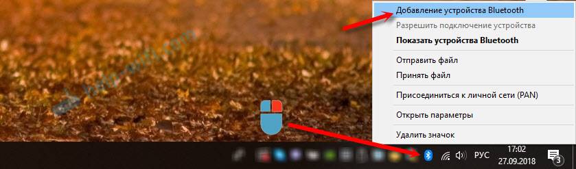 Для подключения нажмите правой кнопкой мыши на иконку Bluetooth и выберите «Добавление устройства».