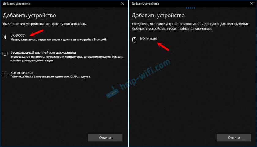 На компьютере, в уже открывшемся окне выбираем пункт «Добавление Bluetooth или другого устройства». Дальше нажимаем на пункт «Bluetooth». Когда в списке появится наша мышка, просто нажмите на нее. В Windows 7 сразу откроется окно, в котором будут отображаться доступные для подключения устройства.