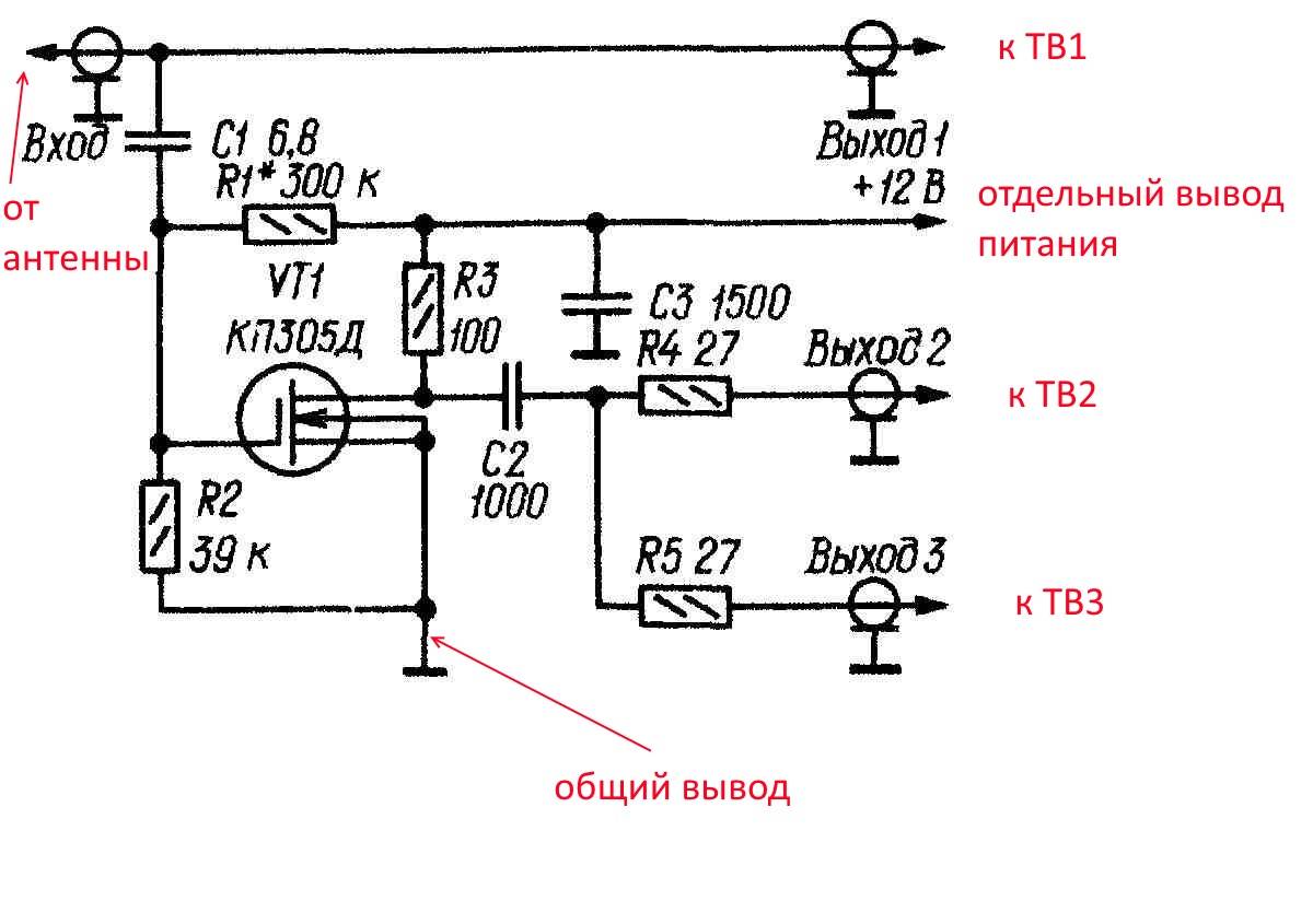 Наибольшее распространение получили активные антенные разветвители с питанием по высокочастотному кабелю. В этом случае можно активный антенный разветвитель установить вместо пассивного в любом месте. Вывод активного разветвителя, по которому поступает питание подключить к одному из телевизоров, рядом с которым расположен блок питания с фильтром. Все остальные телевизоры подключены к остальным выводам активного разветвителя, как и в случае с пассивным разветвителем.