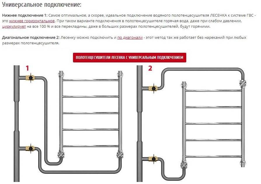 Перекрестная или напольная подводка рекомендуется для изделий в форме лесенки, что дает гарантированную циркуляцию носителя даже при плохом напоре. При подключении осуществляется подсоединение к контуру горячего водоснабжения или создание разборной системы.