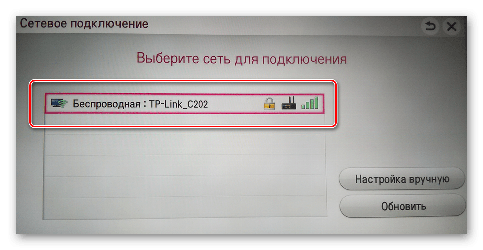 Переходим к телевизору. По аналогии со Способом 1, входим в настройки, открываем вкладку «Сеть» и далее следуем в «Сетевое подключение». Выбираем из возможного списка название именно своей сети и жмём на пульте дистанционного управления «OK».