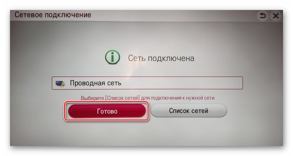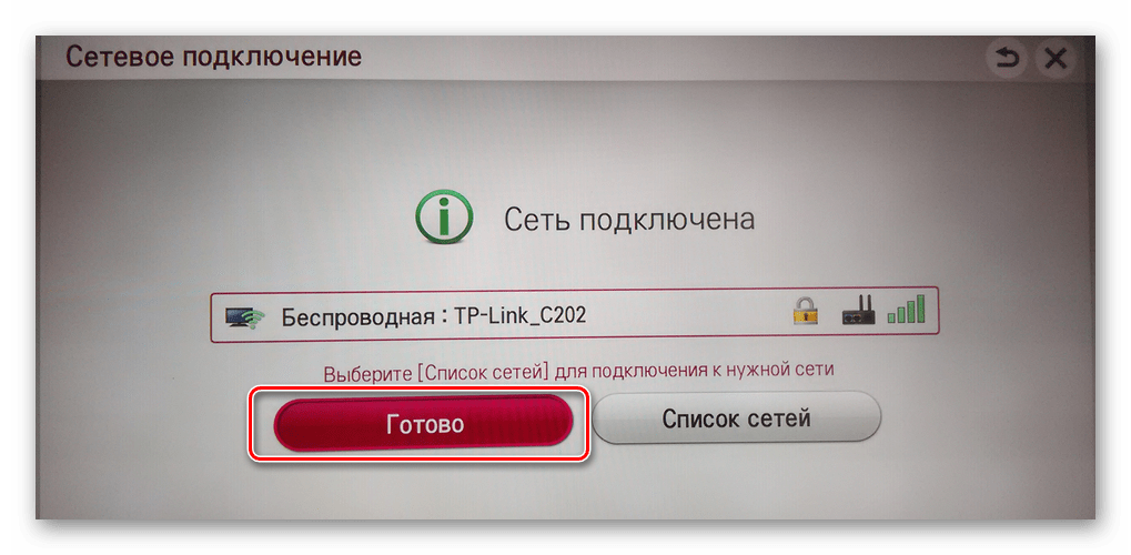 Телевизор сообщает о том, что сеть успешно подключена. Надёжная связь между ТВ и роутером установлена. Жмём на иконку «Готово». Выходим из меню.