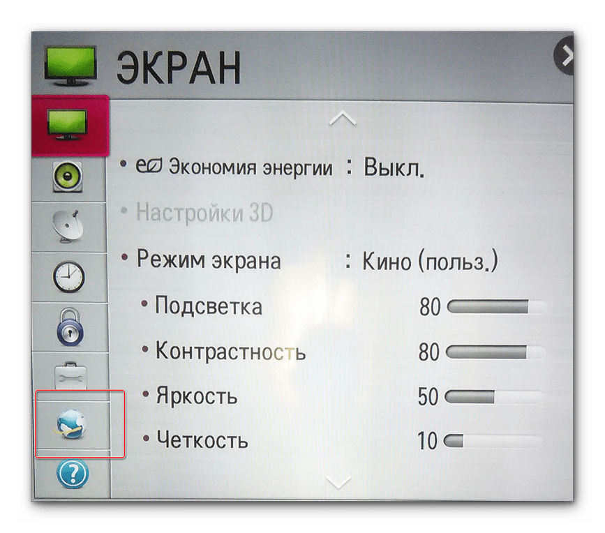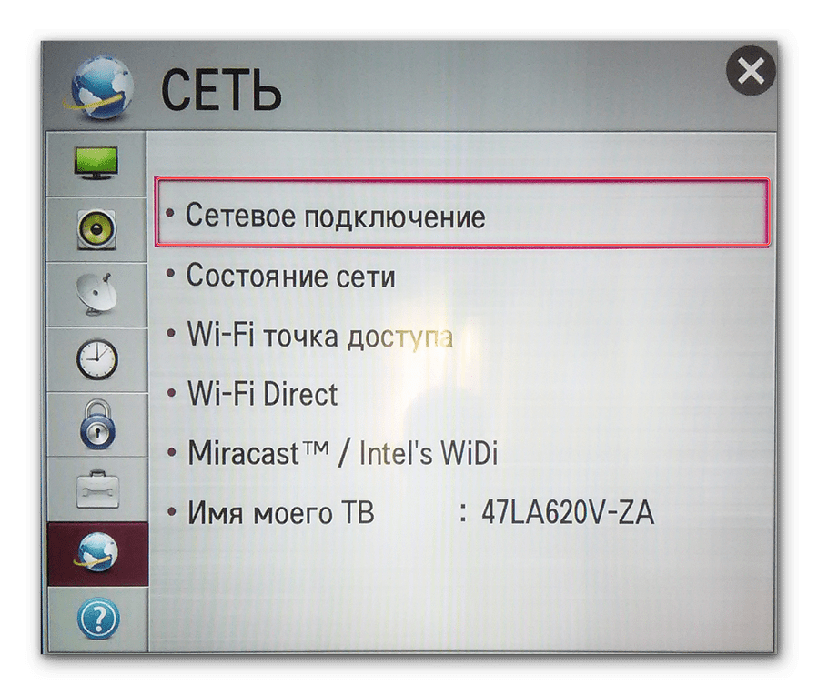 - Открыть пункт «Настроек сетевого подключения» — обычно данный раздел на телевизорах LG и Samsung обозначается иконкой в виде «Земного шара».