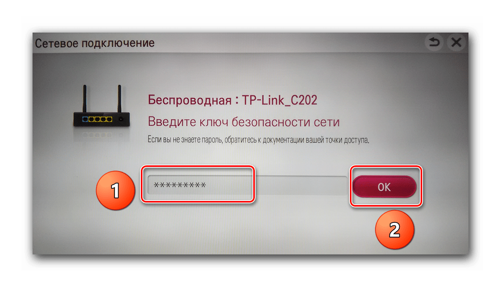В случае если ваша беспроводная сеть защищена паролем, то нужно ввести его по запросу телеприёмника и подтвердить.