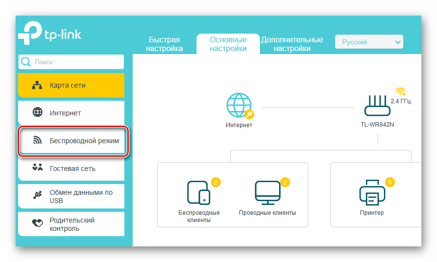 Попав в веб-клиент роутера, открываем страницу с настройками беспроводного режима.