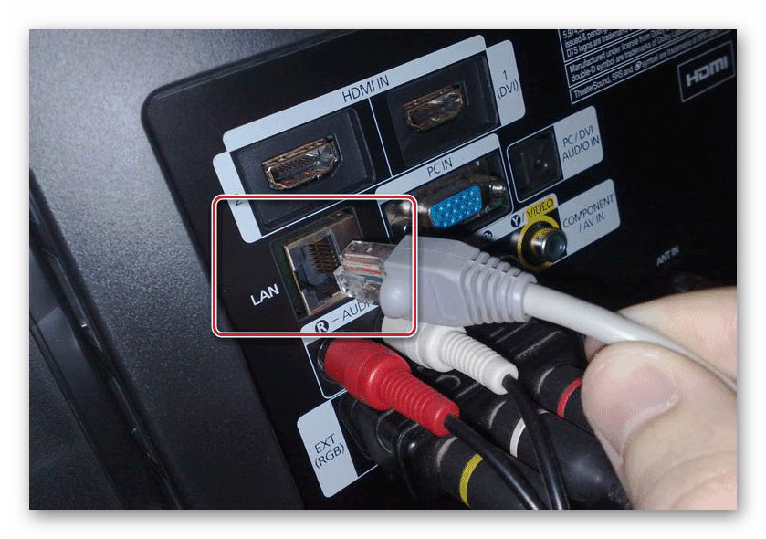 Второй штекер кабеля осторожно втыкаем в разъём LAN смарт-телевизора. Обычно он располагается рядом с другими гнёздами на тыльной стороне устройства