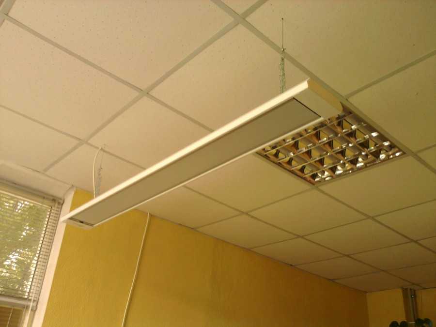 Монтаж инфракрасного потолочного обогревателя гораздо проще, чем работа с пленкой. В данном случае лишь требуется выполнение общих принципов. Во-первых, должно быть хорошее крепление, которое не будет изгибаться под тяжестью веса теплового агрегата. Для установки прибора лучше использовать кронштейны.