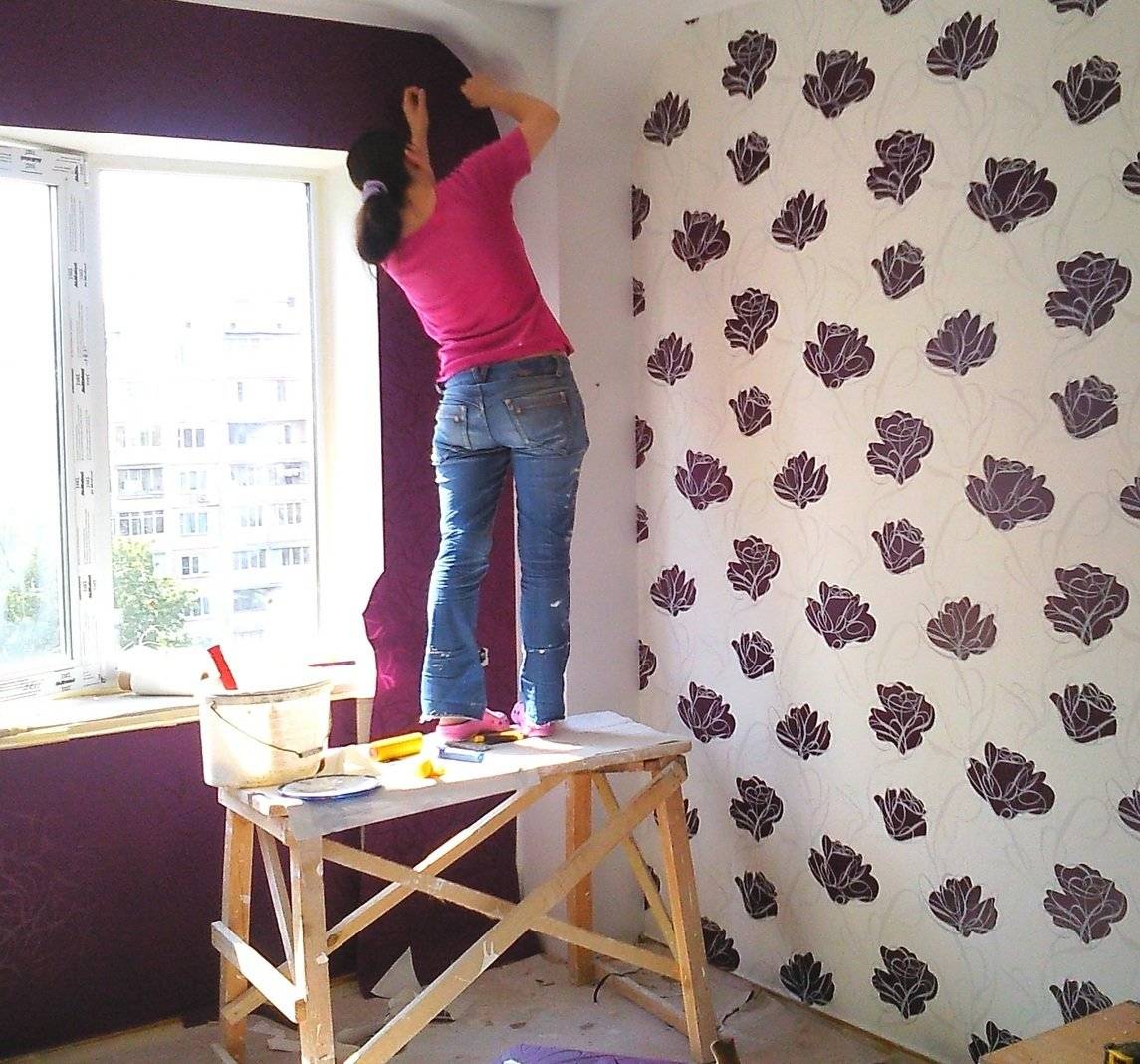 В этих зонах рекомендуется клеить обои, разрезанные на мелкие части. Использовать нужно медленно сохнущий клей, который позволит скорректировать недочеты, убрать ошибки.