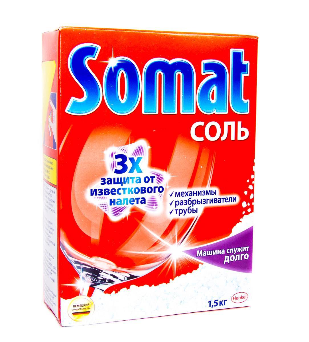 Соль для посудомоечных машин продается в магазинах и имеет соответствующую информацию на этикетке. Она представляет собой очищенные спрессованные кристаллы, которые не содержат посторонних примесей и медленно растворяются под воздействием жидкости.
