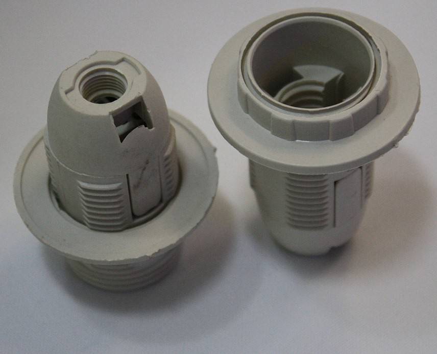 - Отечественные конструкции – цоколь, карболитовый Е-27. Корпус состоит из карболита, разборный, внутренние элементы фарфоровые. Патроны практичны в работе. В этом случае меняется поврежденный отдельный узел.