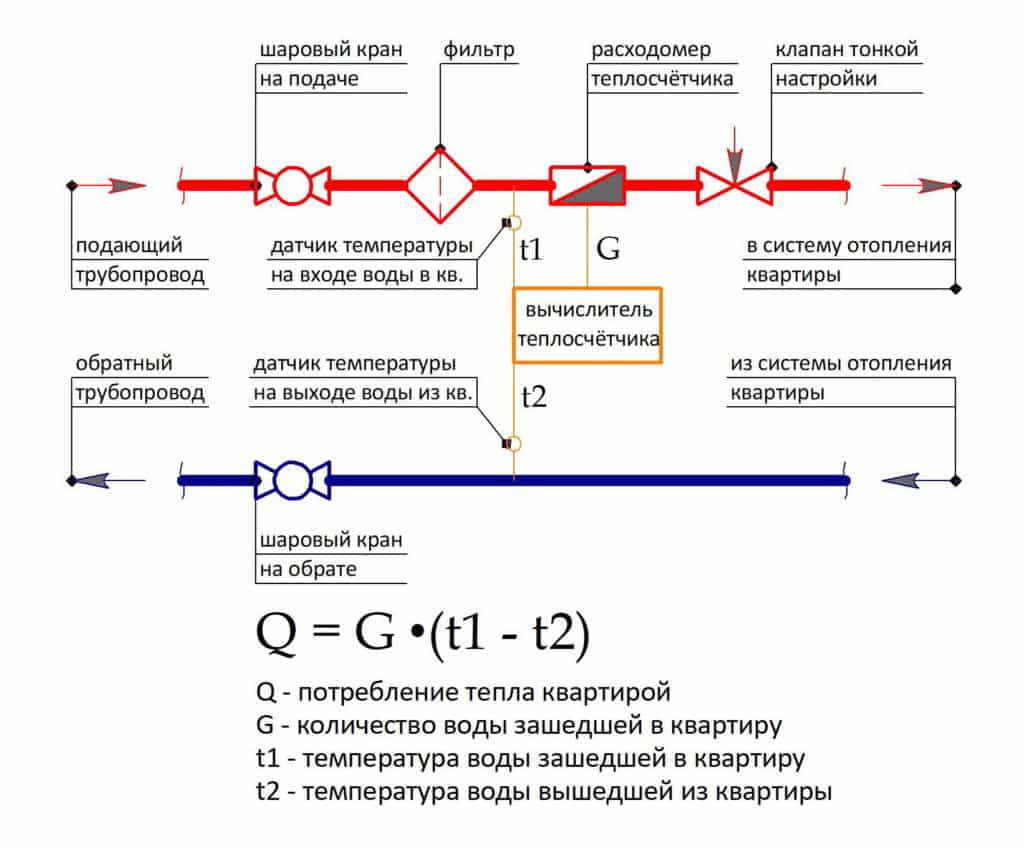 Количество теплоты вычисляют произведением расхода воды, прошедшей по отопительной системе, и разницей температур поступившего и вышедшего теплоносителя, что выражается формулой