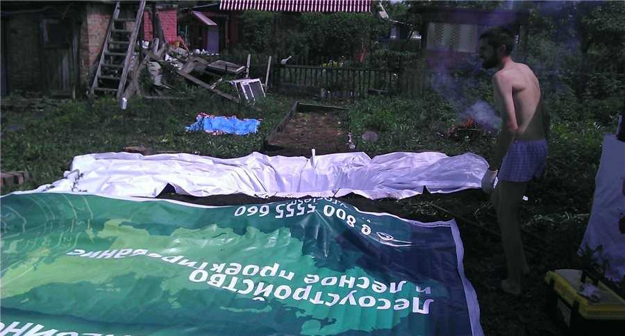 В вырытый котлован укладываем пленку, расправляем. Для пробы был вырыт небольшой по размерам котлован: вдруг не понравится. Так как баннеры, все-таки старые, уложили два. Второй тоже постарались расправить.