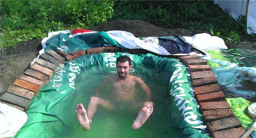 Яма под бассейн Стандартный недостаток временного сооружения – необходимость в частой смене воды. Если это не пугает и участок небольшой, вариант из подручных материалов вполне подходит.