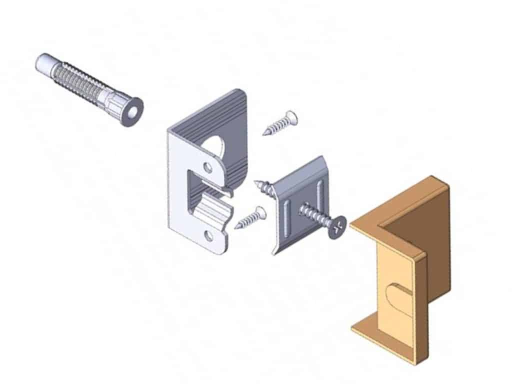 Фирменное крепление ИКЕА обладает рядом положительных свойств. Специальные уголки устанавливаются изнутри шкафа на его боковые стенки. Это позволяет вести монтаж мебели одному человеку. Шкафы можно установить на временной подставке и сверлить отверстия в стене под крепеж прямо через заднюю стенку ящика. К мебели уголок прикручивается двумя саморезами.
