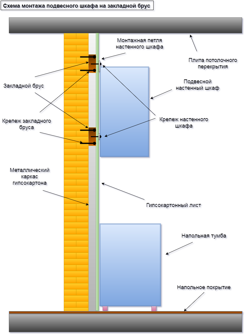 Для тяжелых шкафов используют 2 закладные одна вверху, вторая – внизу шкафа. Сам брус можно зафиксировать в черновой стене из кирпича или бетона.
