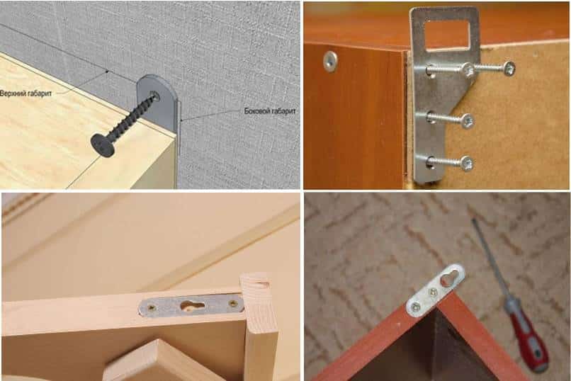 Достаточно популярно крепление кухонного гарнитура с помощью уголков. Они позволяют регулировать положение ящика на стене в небольших пределах. Уголки крепятся к верхней панели шкафа, и это обстоятельство необходимо учитывать. Если верхняя стенка ящика скреплена с его боковыми стенками недостаточно надежно, она может выломаться, и мебель упадет. То же самое может произойти, если кухонный гарнитур изготовлен из некачественной ДСП.