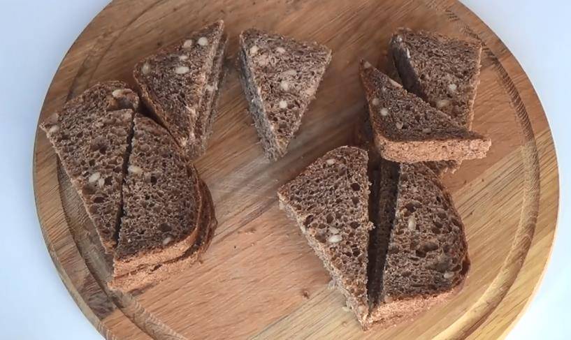 Хлеб нарезать на одинаковые ломтики, каждый из них нарубить пополам, а затем на треугольники.