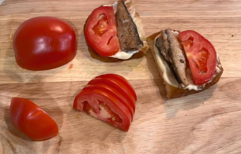 - В конце процесс приготовления завершает третий тост, который кладется сверху на фрукт и помидор.