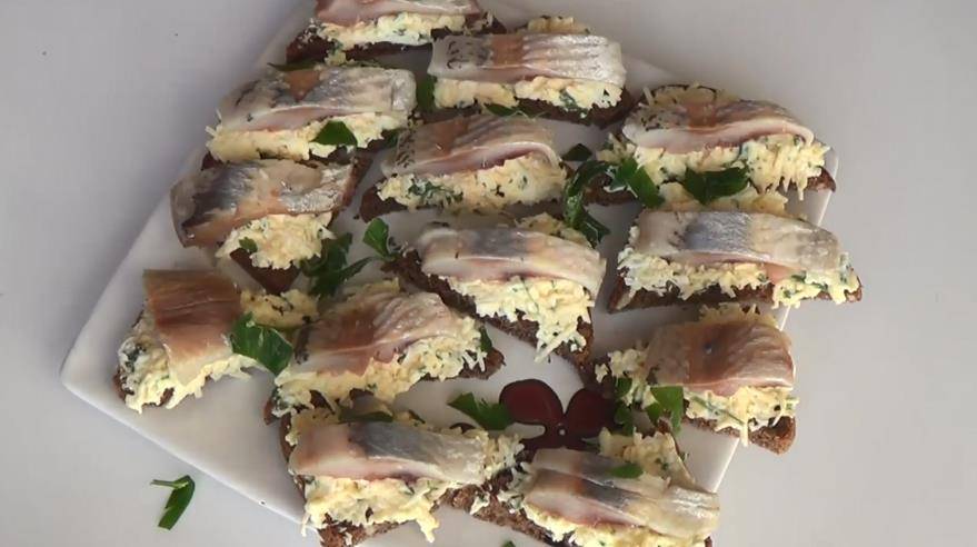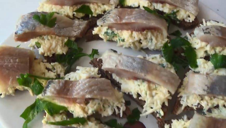 Еще одной желанной закуской для праздничного стола является бутерброд со слабосоленой селедкой. Этот пикантный вариант поедают в первую очередь, потому что он яркий и аппетитный. Для подобного лакомства настоятельно рекомендуется применять черный бородинский хлеб.
