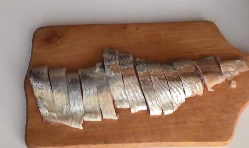 Выпотрошить селедку, удалить внутренности, плавники, хвост. Очистить тушку от хребта, косточек и кожицы, нарезать поперек сантиметровыми кусочками.