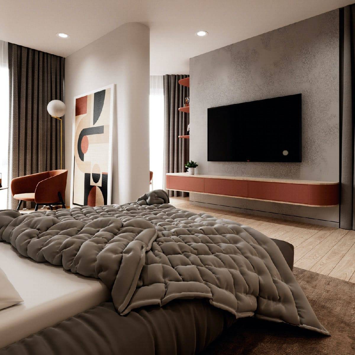 Что касается бежевого цвета стен. В самом оттенке ничего плохого нет, но интерьеры в коричнево-бежевых тонах всем порядком надоели. В тренде спокойные природные оттенки и насыщенные темные цвета.