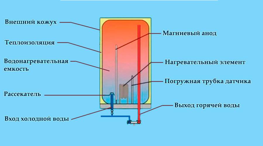 Конструкция накопительных водонагревателей напоминает термос. Внутренний бак встроен в наружный кожух, между их стенками находится теплоизоляционный материал. Габариты устройства зависят от требуемой емкости воды и конструкции. Нагревательный элемент может быть расположен внутри бака с водой или обвит вокруг него между стенками прибора.