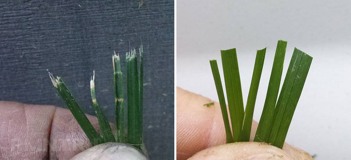 Слева: трава, срезанная затупленным лезвием газонокосилки. Справа: трава, срезанная острым лезвием