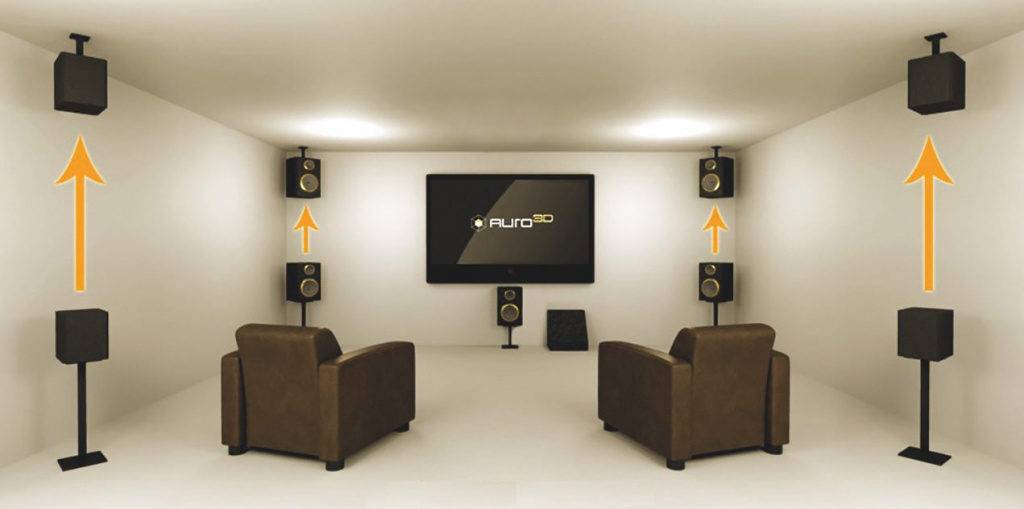 Тыловые колонки размещают непосредственно над головой зрителей, что позволяет создать ощущение окружения звуком.