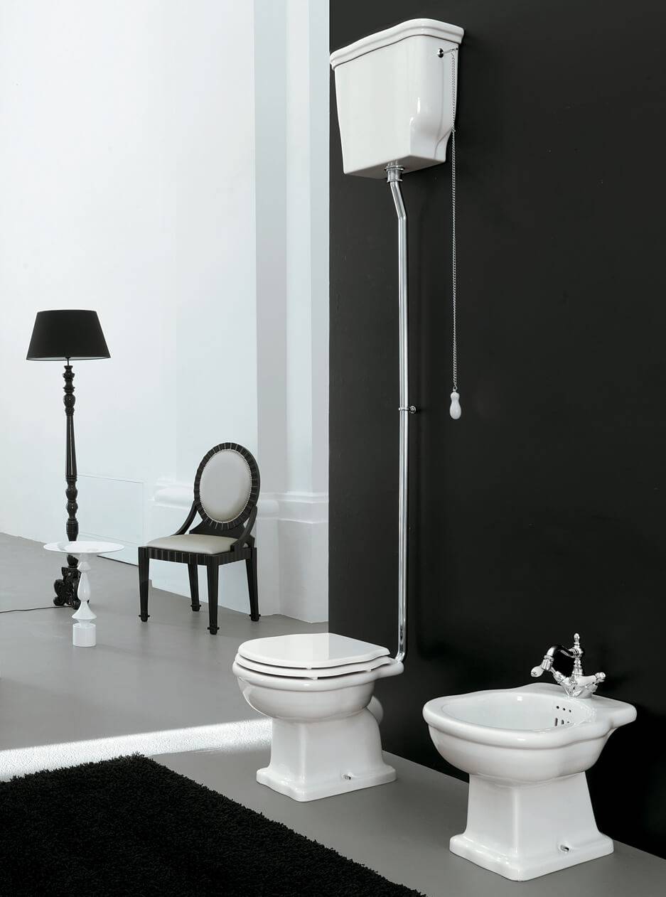 Когда-то такие конструкции устанавливали и в квартирах, теперь — только в общественных туалетах. Бачок крепится почти под потолком и связывается с унитазом трубой. Достоинство решения: вода спускается в чашу с большим напором, эффективно смывая испражнения.