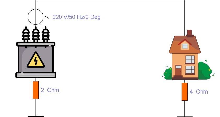 На рисунке выше схематически показан трансформатор с заземленной нейтралью. Сопротивление заземлителя примем равным 2 Ом. Смоделирован пробой фазы на заземленный корпус в доме с системой заземления TT. Фаза пошла в землю через контур заземления 4 Ом, далее к генератору через землю и заземление самого генератора 2 Ом. Земля это проводник, но не идеальный. Заземлением мы улучшаем проводимость, но на пути все равно имеется сопротивление — 4 Ом и 2 Ом. Другими словами, если бы сопротивления были ничтожно малыми и стремились к нулю, то данная цепь от отдельного заземлителя к заземлителю трансформатора выступила бы в роли полноценного нулевого рабочего проводника, замкнувшего фазу. Но так как сопротивление цепи заземления все же имеется, то при замыкании фазы на землю, ток короткого замыкания будет напрямую зависеть от его значения.